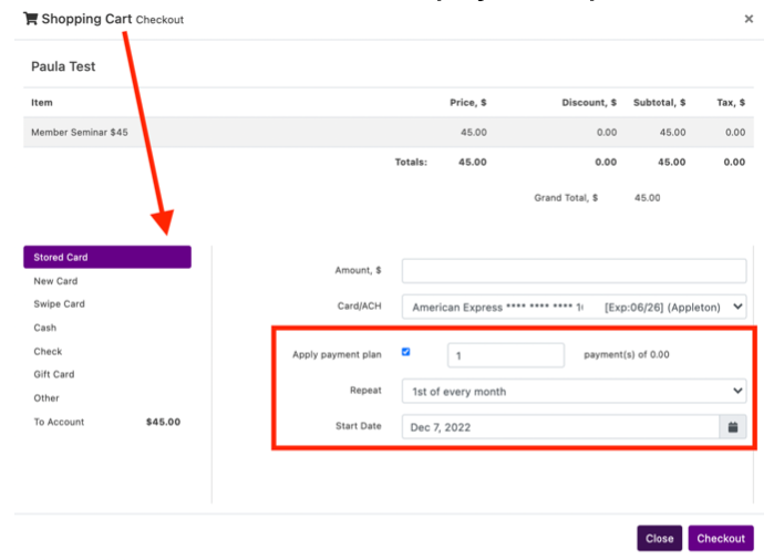 Payment plans can be made for anydirectly from the admin shopping cart. When you are selecting the payment type, if credit card is selected, check the “apply payment plan” box and then fill in the details and a payment plan is created.